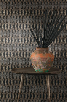 Vliesová tapeta na zeď, jemně plastické etno vzory, odstíny hnědé, černé, místy pololesklé zlaté akcenty.