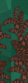 Vliesová obrazová tapeta na zeď, podklad evokující hrubší textilii a linie tvořící etno vzor listů, odstíny zelené, hnědé, cihlově červené.