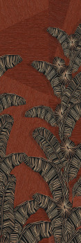 Vliesová obrazová tapeta na zeď, podklad evokující hrubší textilii a linie tvořící etno vzor listů, odstíny cihlově červené a hnědé.