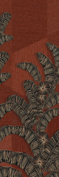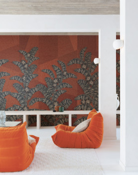 Vliesová obrazová tapeta na zeď, podklad evokující hrubší textilii a linie tvořící etno vzor listů, odstíny cihlově červené a hnědé.