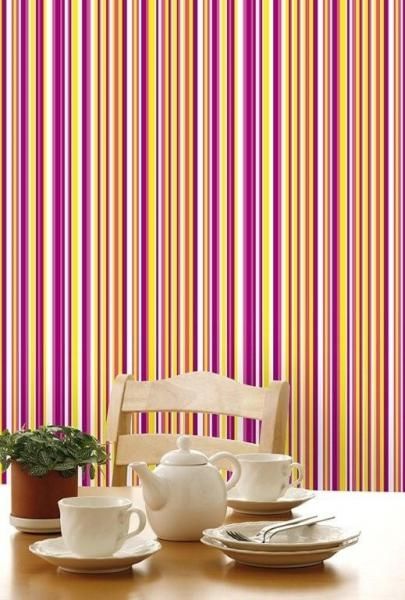 Vliesová tapeta s proužkovým vzorem ve žlutých, růžových a fialových odstínech.