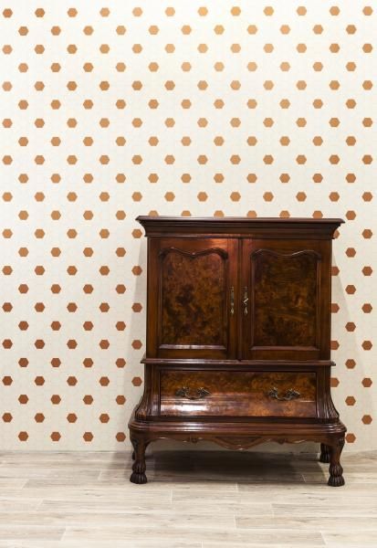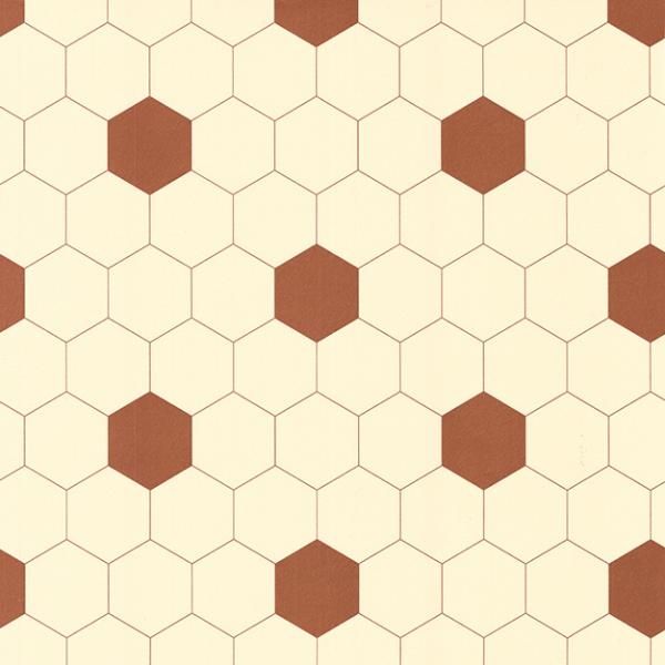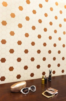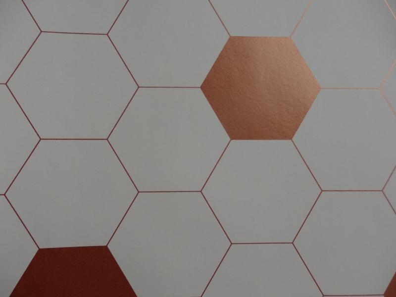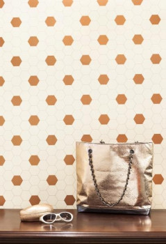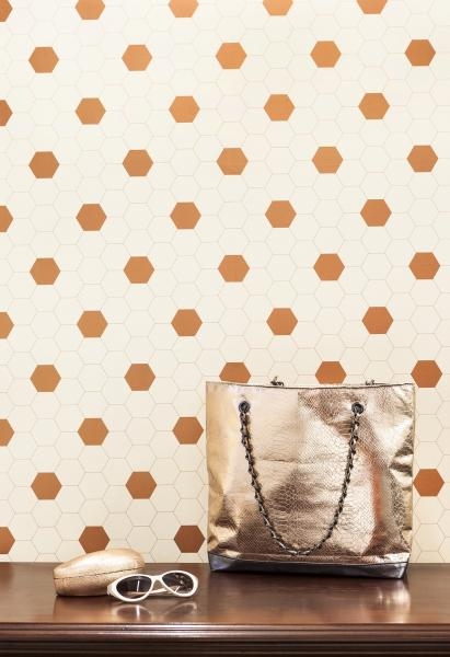 Vliesová tapeta. Vzor bronzových hexagonů na béžovém podkladu.