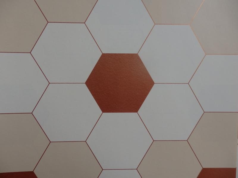 Vliesová tapeta. Vzor bronzových hexagonů lemovaných béžovou a krémovou barvou.