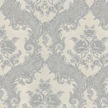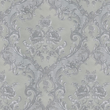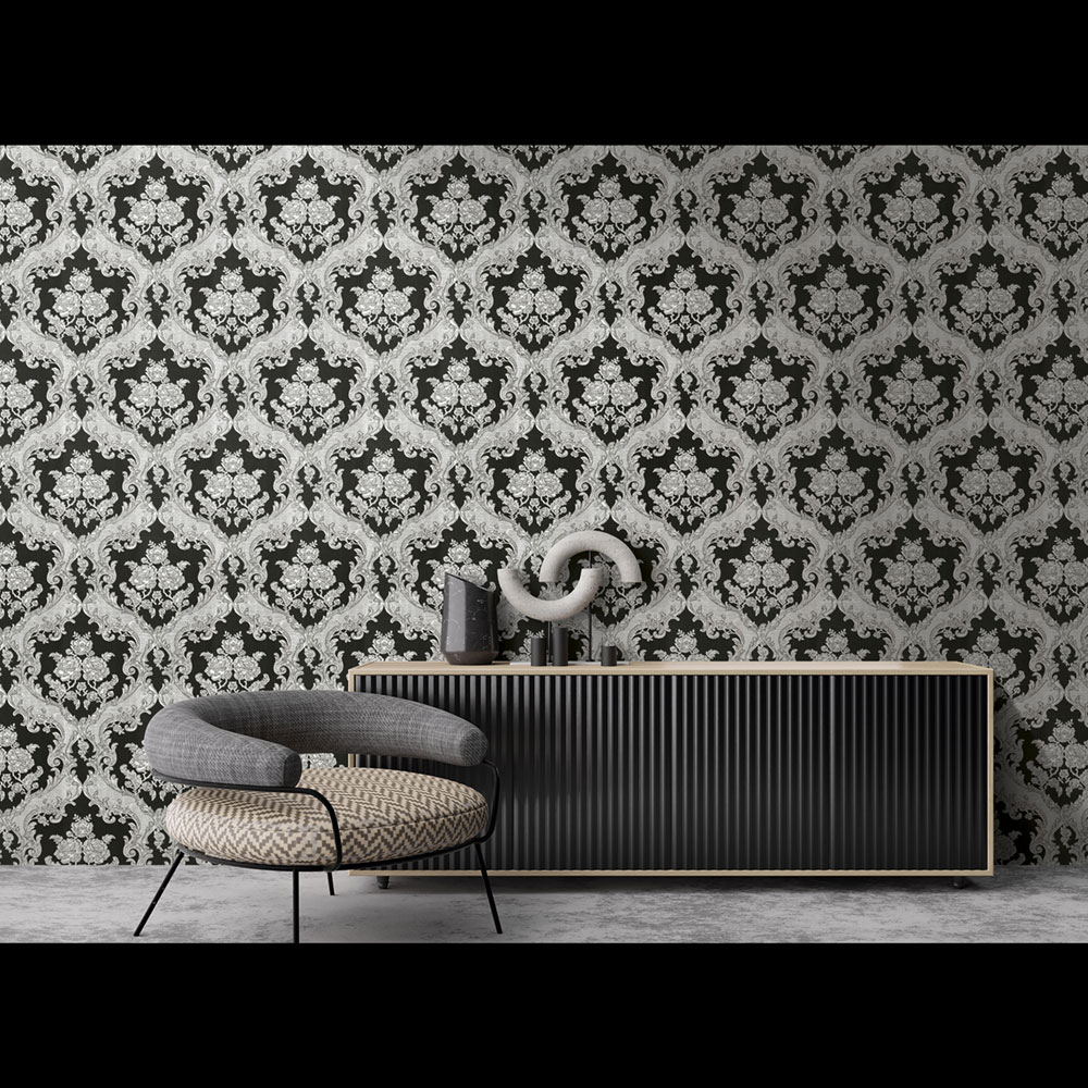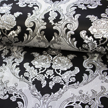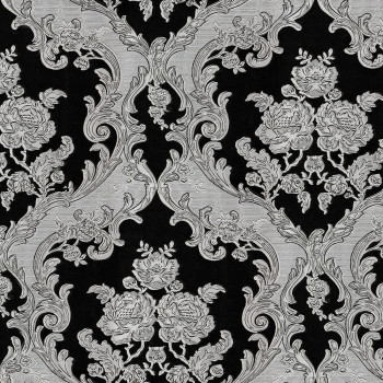 Luxusní vliesová tapeta s vinylovým povrchem, černý podklad, stříbrný zámecký vzor.