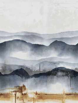 Vliesová tapeta na zeď, motiv pohledu na horizont, odstíny šedo-modré a hnědé.