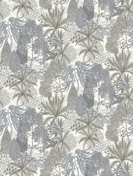 Vliesová tapeta na zeď, motivy rostlin a listů v odstínech šedé, šedo-hnědé.