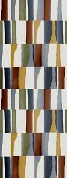 Geometrická vliesová tapeta na zeď, odstíny bílé, vínové, okrové, modré a zelené.