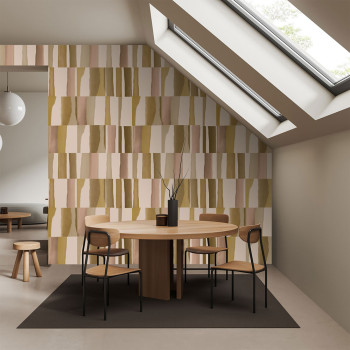 Geometrická vliesová tapeta na zeď, odstíny hnědé, béžové, okrové a pudrově růžové.