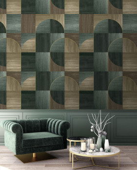 Geometrická vliesová tapeta na zeď, odstíny zelené a hnědé, evokuje dřevěný stěnový obklad.