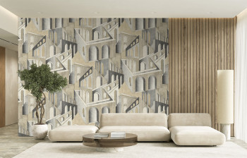 Grafická vliesová tapeta na zeď, odstíny šedé a béžové, architektonický design.