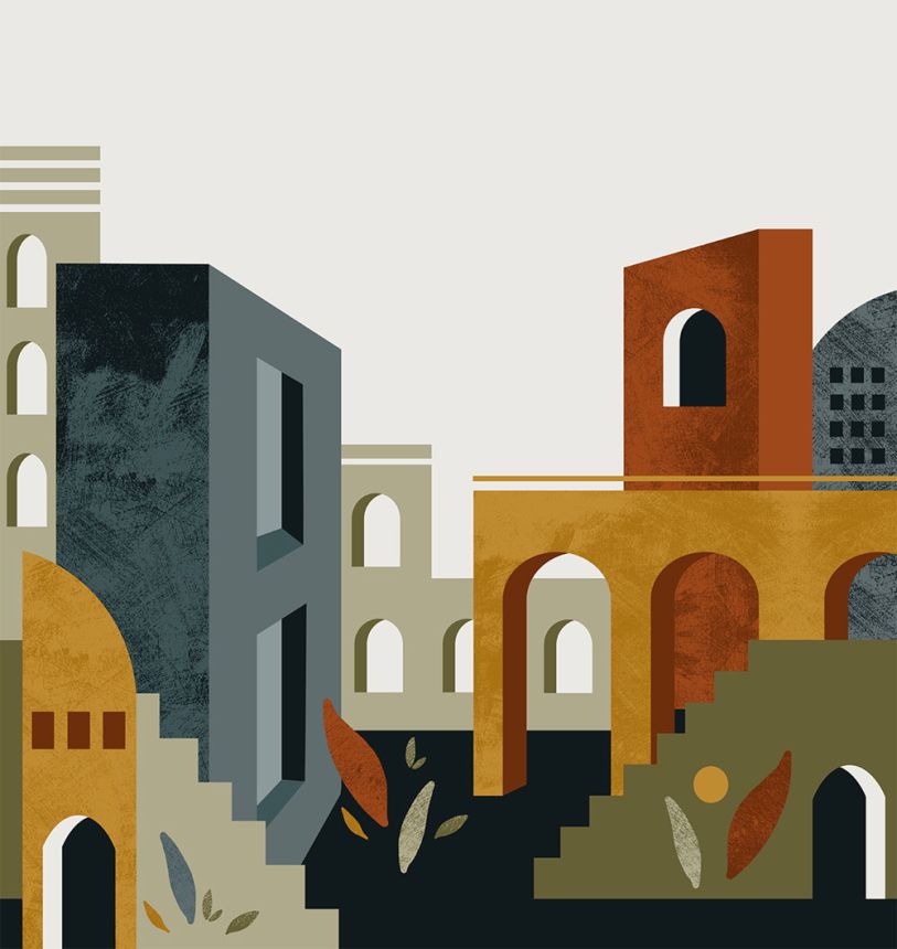 Grafická vliesová tapeta na zeď, odstíny hnědo-červené, modré, okrové, zelené a šedo-béžové, architektonický design.
