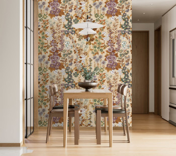 Vliesová tapeta na zeď, květinové motivy, odstíny vínové, hnědé, šedé, modré, zelené, béžový podklad.
