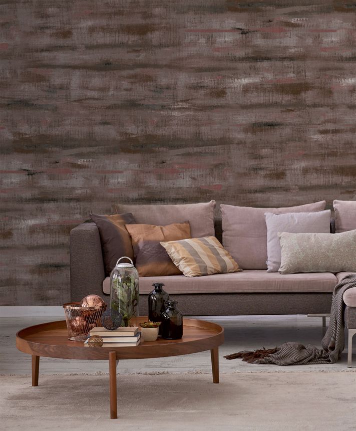 Vliesová tapeta na zeď, imitace malby stětcem v odstínech hnědé / hnědo-červené.