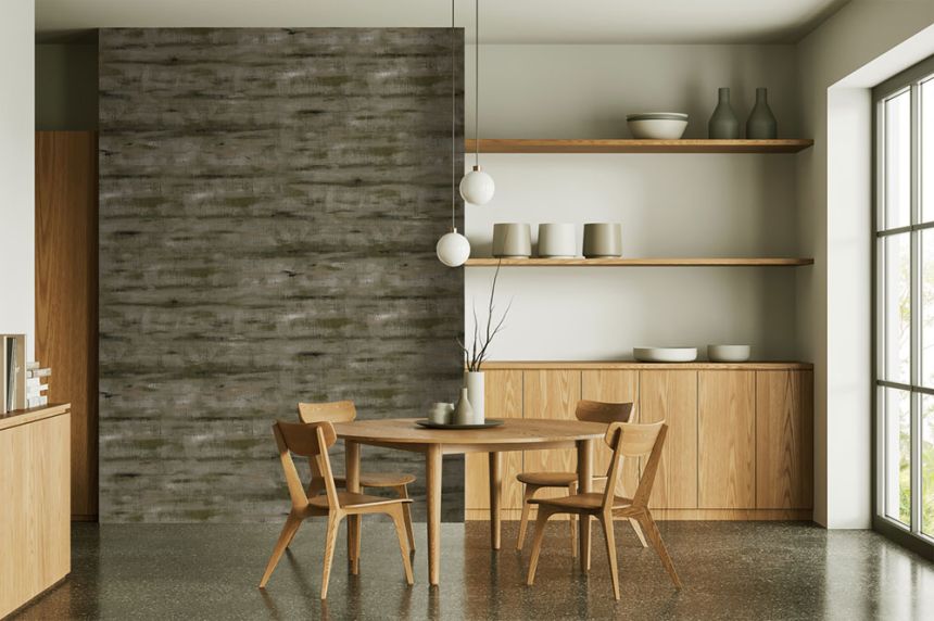 Vliesová tapeta na zeď, imitace malby stětcem v odstínech hnědo-zelená.