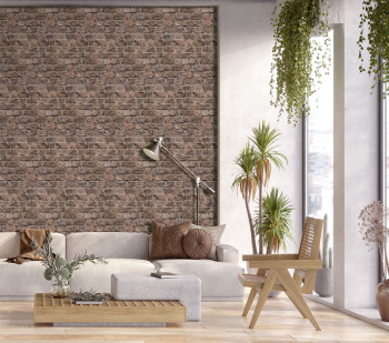 Vliesová tapeta na zeď, cihly, cihlová zeď v odstínech hnědo-červené.