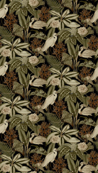 Vliesová tapeta na zeď, tropické listy a volavky, odstíny černé, hnědé a zelené.