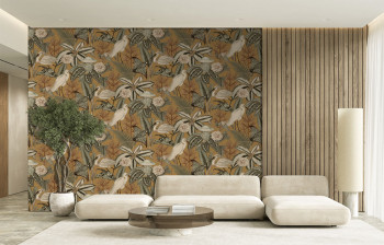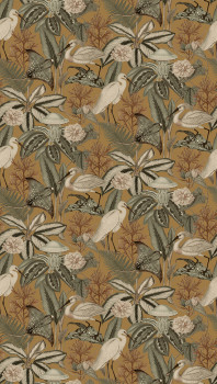 Vliesová tapeta na zeď, tropické listy a volavky, odstíny hořčicové, šedo-zelené a béžové-