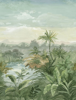 Vliesová tapeta na zeď, krajina s palmami a tropickými listy, odstíny zelené, modré a okrové.