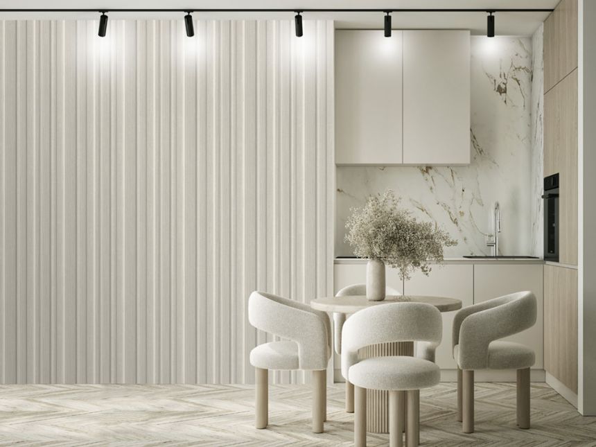 Vliesová tapeta na zeď, 3D efekt, imitace dřevěných lamel, odstíny šedé, šedo-krémové / greige.