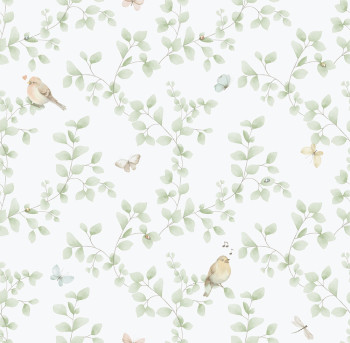 Vliesová tapeta na zeď, motivy zpívajících ptáčků ve větvích v odstínech zelené, okrové a bledě růžové a modré, textura velmi jemné látky.