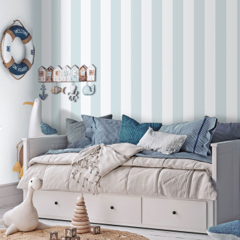 Vliesová tapeta na zeď, modro-bílé pruhy, textura velmi jemné látky.