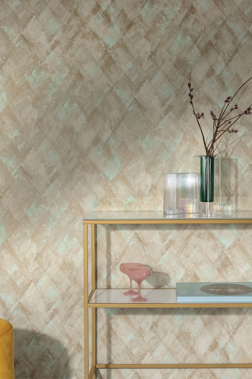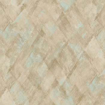 Vliesová tapeta s vinylovým povrchem, žíhaná textura tvoří vzor diamantu, odstíny béžové, tyrkysové a hnědo-zlaté.