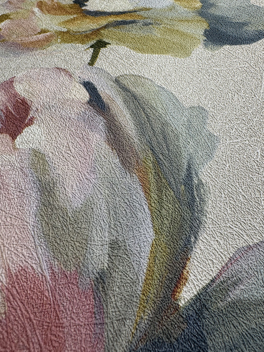 Vliesová tapeta s vinylovým povrchem, květinový vzor v odstínech šedé, růžové, zelené, modré a fialové - jemná vláknitá textura.
