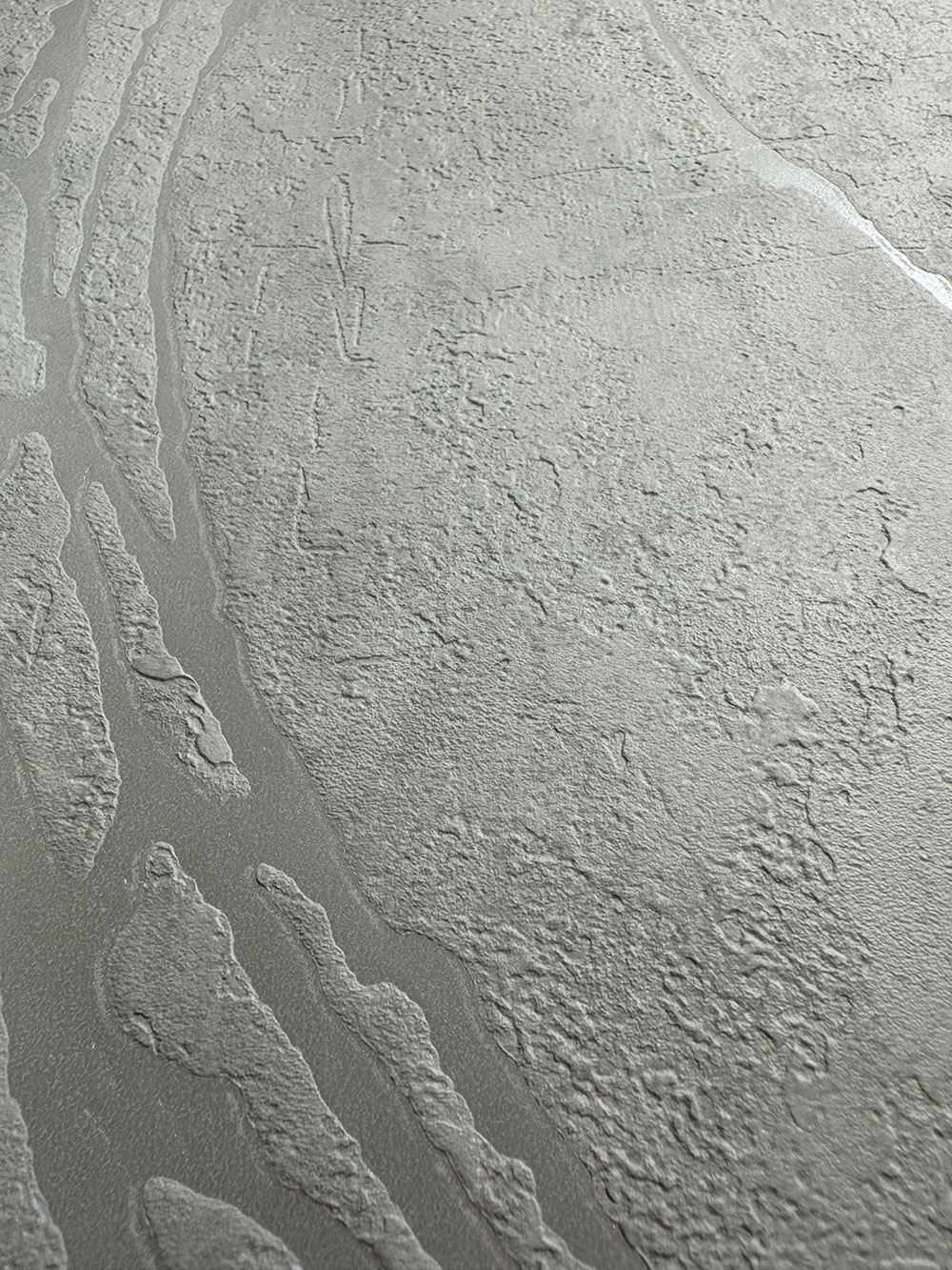 Vliesová tapeta s vinylovým povrchem, imitace štuku / betonu v odstínech bílé a světle šedé, pololesklé prolisované linie.