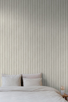 Vliesová tapeta s vinylovým povrchem, šedé pruhy, místy metalický pololesk.