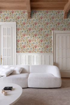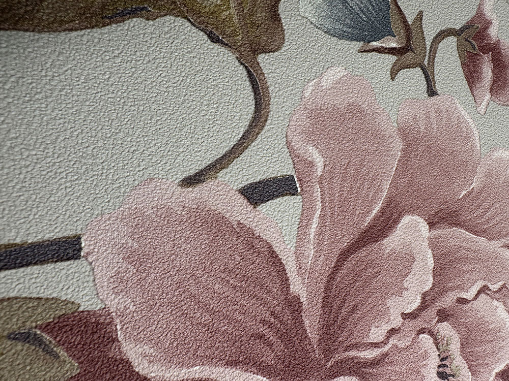 Vliesová tapeta s vinylovým povrchem, béžový podklad, květiny v odstínech růžové, hnědé a šedo-modré.