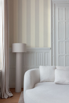 Vliesová tapeta s vinylovým povrchem, šedé pruhy, jemná látková textura.