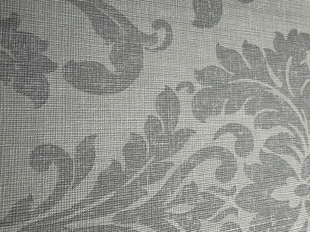 Vliesová tapeta s vinylovým povrchem, jemná látková textura, ornamentální zámecký vzor, odstíny šedé.