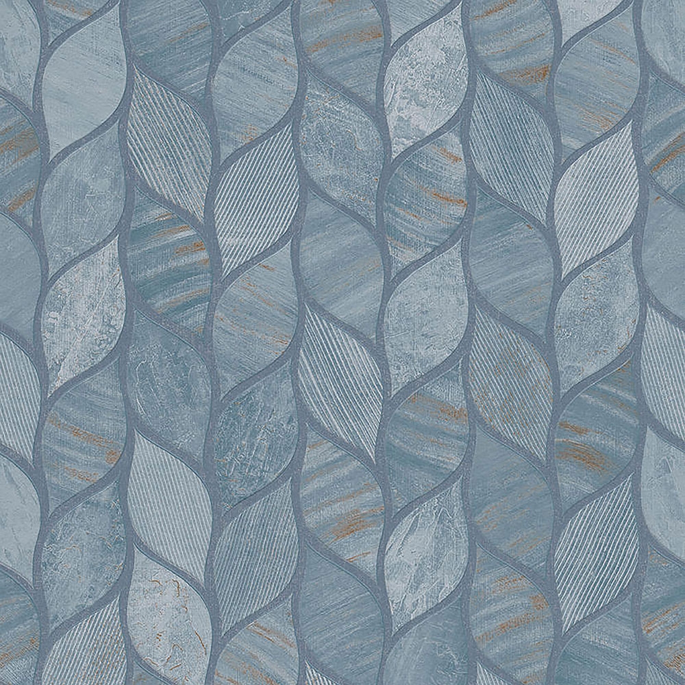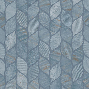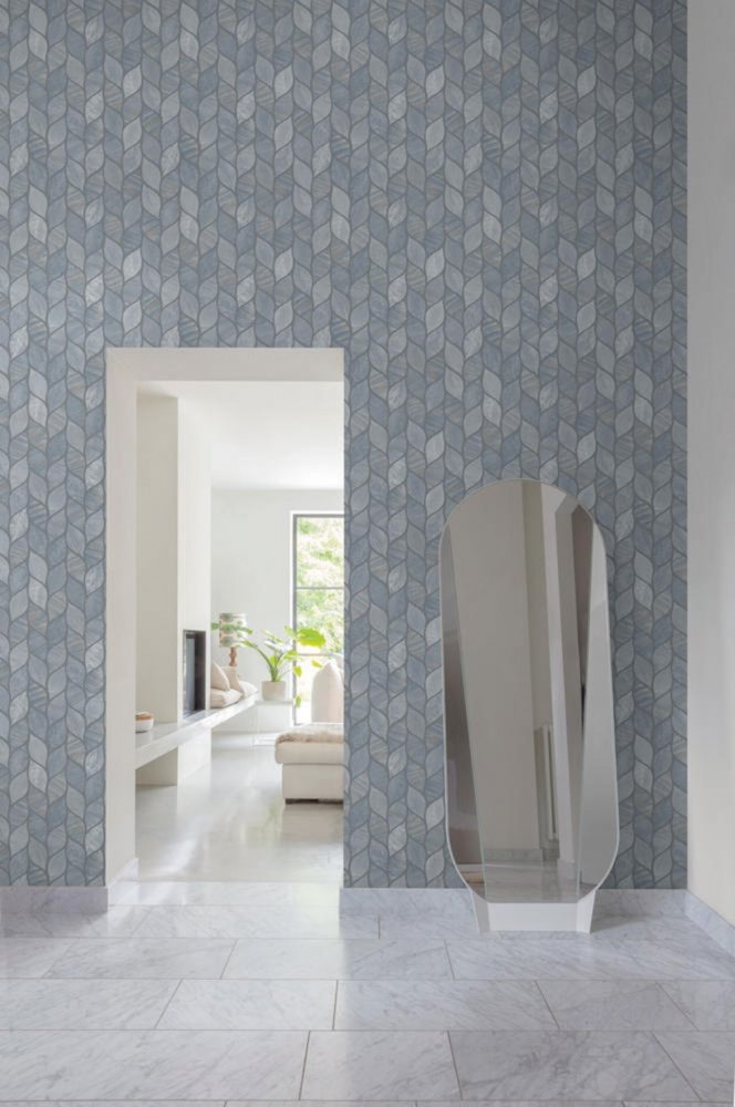 Vliesová, omyvatelná, modrá tapeta se vzorem listů.