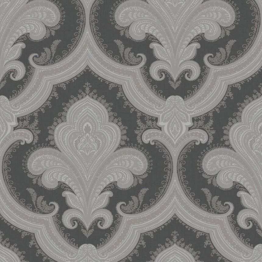 Luxusní vliesová tapeta s vinylovým povrchem, zámecký vzor v odstínech pololesklé černé a stříbrné.