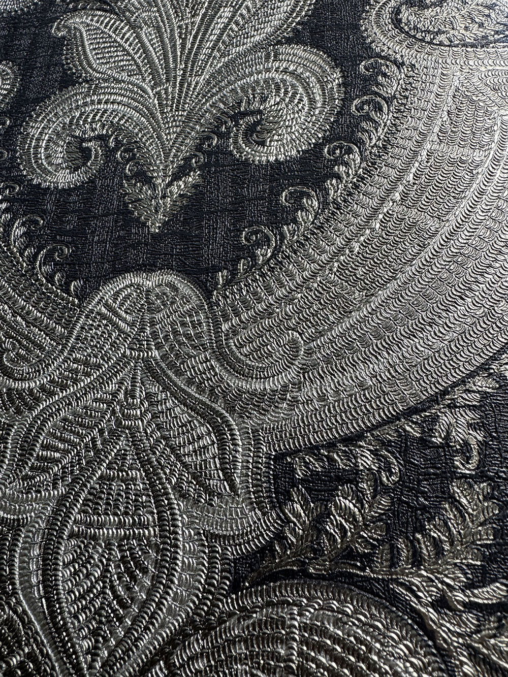 Luxusní vliesová tapeta s vinylovým povrchem, zámecký vzor v odstínech pololesklé černé a stříbrné.