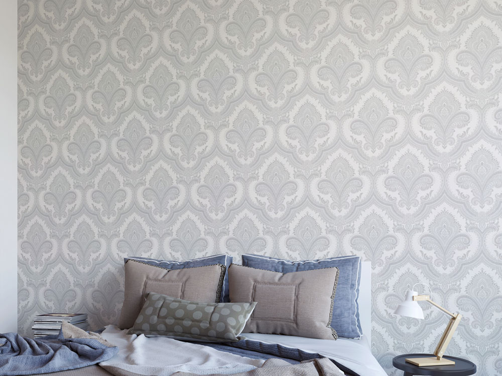 Luxusní vliesová tapeta s vinylovým povrchem, zámecký vzor v odstínech pololesklé bílé a modré.