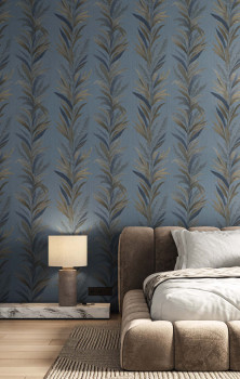 Vliesová tapeta s vinylovým povrchem, modrý proužkový podklad s motivy listů v kovově lesklých odstínech hnědo-zlaté, modré a šedo-modré.