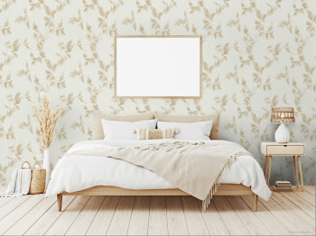 Vliesová tapeta s vinylovým povrchem, krémový proužkový podklad s motivy listů v kovově lesklých odstínech zlato-béžové.