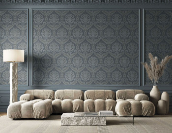 Vliesová tapeta s vinylovým povrchem, odstíny modré a hnědé, zámecký damaškový vzor, textilní struktura.