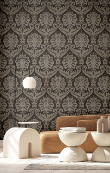 Vliesová tapeta s vinylovým povrchem, odstíny černé a šedé, kovově zlaté detaily, zámecký damaškový vzor, textilní struktura.
