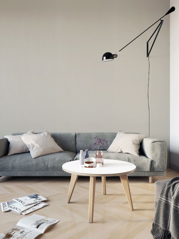 Vliesová, šedo-bílá tapeta s imitací látky.