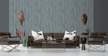 Vliesová tapeta, imitace šedého dřeva s prosvítajícími bronzovými prolisy. Podklad vlies, povrch omyvatelný vinyl.
