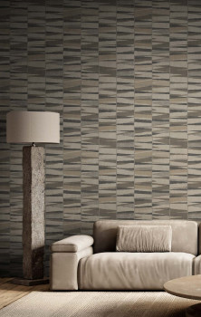 Luxusní vliesová tapeta na zeď, látková textura, vzor v odstínech šedé, černé a hnědé.