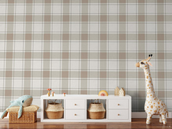 Vliesová tapeta s vinylovým povrchem, imitace kárované látky v odstínech šedé a šedo-béžové.