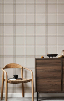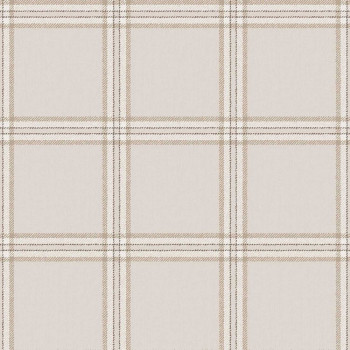 Vliesová tapeta s vinylovým povrchem, imitace kárované látky v odstínech šedo-béžové.