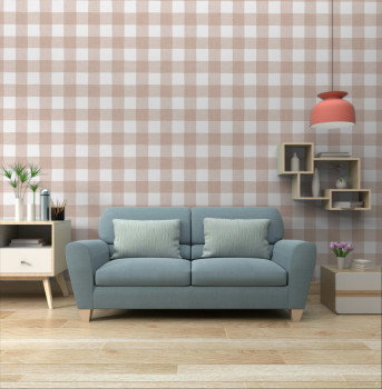 Vliesová tapeta s vinylovým povrchem, imitace kárované látky v odstínech růžové a krémové.