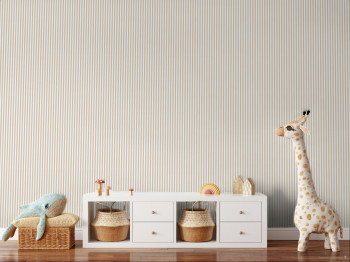Vliesová tapeta s vinylovým povrchem, imitace proužkované látky v odstínech béžové a bílé.