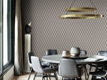 Vliesová tapeta s vinylovým povrchem s geometrickým vzorem. Odstíny hnědé a šedo-béžové, jemná žíhaná látková textura.