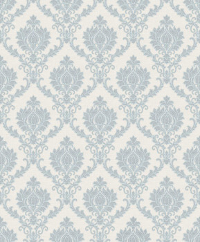 Vliesová tapeta s vinylovým povrchem, zámecký damaškový vzor - krémový podklad, vzor odstíny modré.