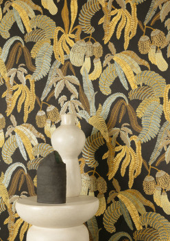 Vliesová tapeta na zeď, černý podklad, vzor listů v odstínech hnědé, okrové a šedo-zelené metalické.